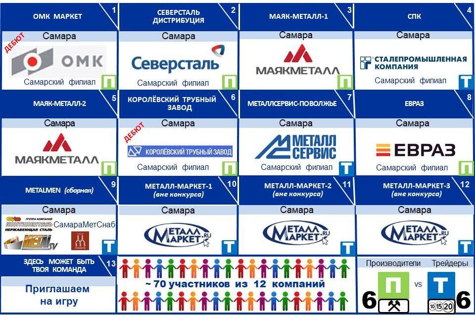 21.12.22 в 18:18:18 в Самаре (кафе "Феникс", ул. Авроры, 150 "А") состоится очная игра. В региональной версии уникального металлоквиза примут участие 12 команд. Команды представляют 12 металлокомпаний различных направлений: производство и трейдинг проката черных и цветных металлов, нержавейки, продуктов металлопереработки и др. Одной из новаций этого года будет деление всех команд на 2 конференции: Производители vs Трейдеры. В конце игры будут подведены итоги как командного зачёта, так и между конференциями. На премьере в Москве производители опередили трейдеров (по среднему баллу) на 25,22%.