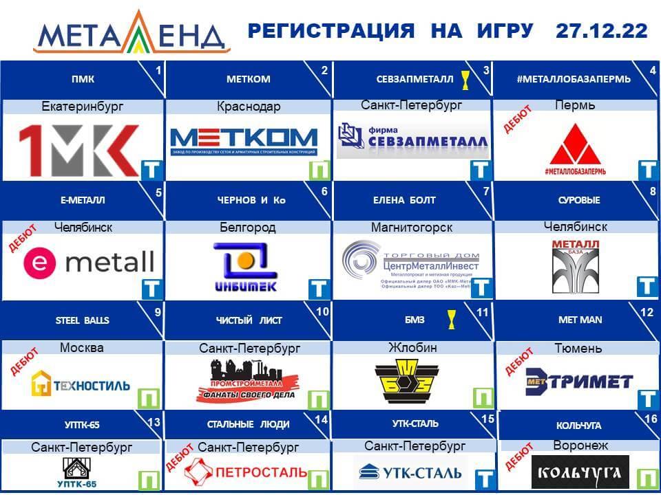 Напоминаем, что 27.12 в 18:00 (мск) пройдёт заключительная игра 2022 года ‒ международная онлайн-игра "МЕТАЛЛЛЕНД". На данный момент уже зарегистрировались 16 команд (из 16 металлокомпаний) из 12 городов РФ и Беларуси.