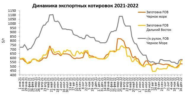 По данным "ЕВРАЗ Маркет", на внешних рынках стоимость российской стальной продукции пошла вверх - благодаря подорожанию металлолома, поднялись котировки на заготовку в Турции. Предложения российских экспортёров на заготовку к концу декабря находятся на отметке 520-530 $/т FOB Черное море.