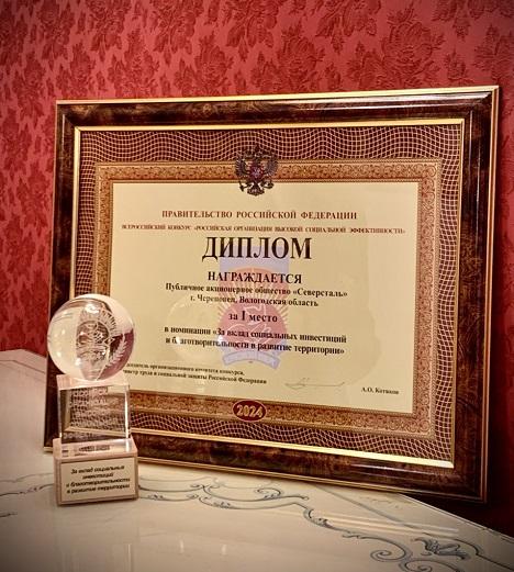 Компания «Северсталь» заняла первое место в номинации «За вклад социальных инвестиций и благотворительности в развитие территории» федерального этапа всероссийского конкурса «Российская организация высокой социальной эффективности – 2024».